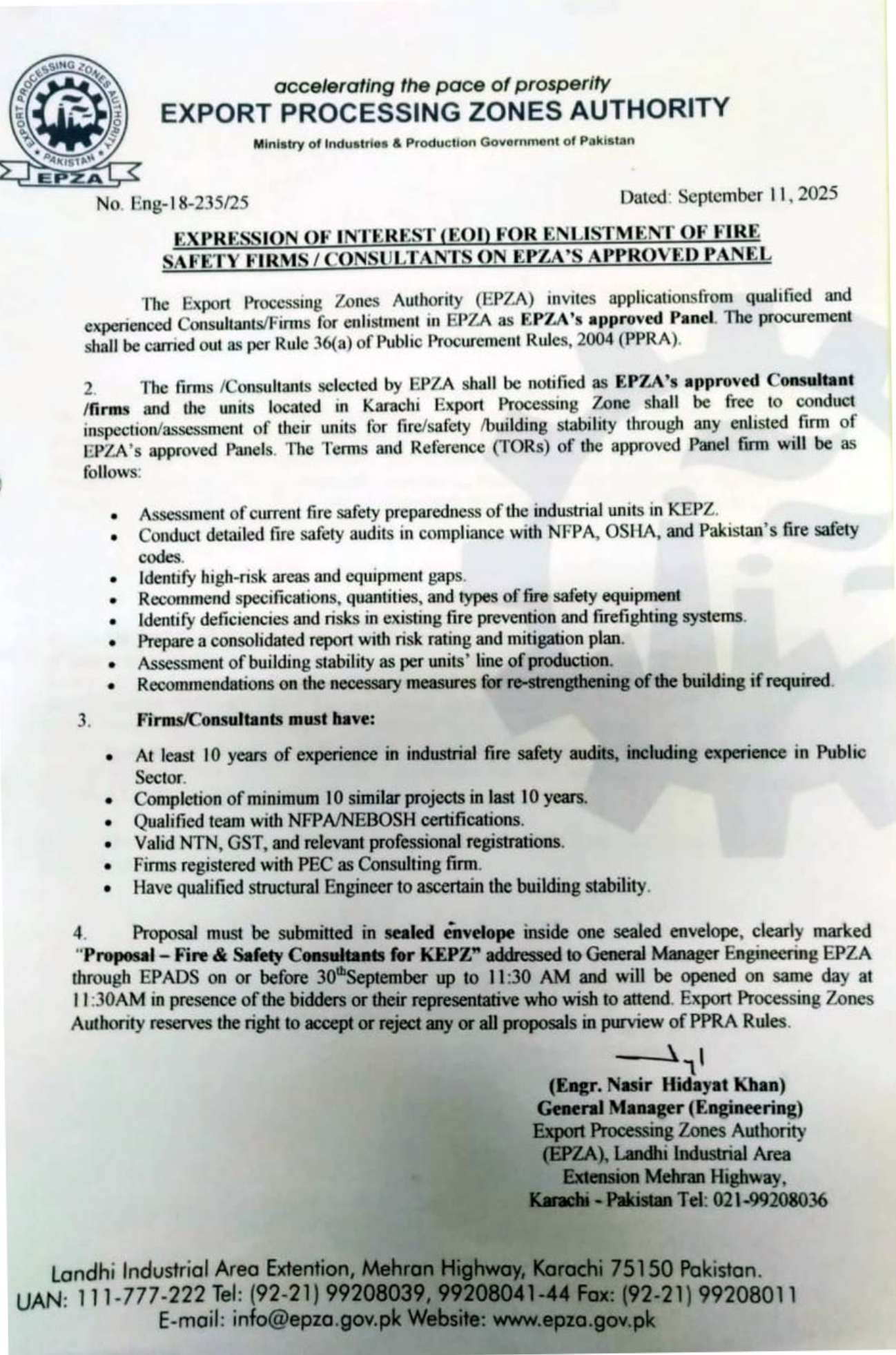 13SepSeptember 13, 2025 EOI for Enlistment of Fire Safety Firm-Consultants on EPZAs Approved Panel admin2025-09-13T09:04:41+00:00 By admin Circulars & Notifications 0 Comments