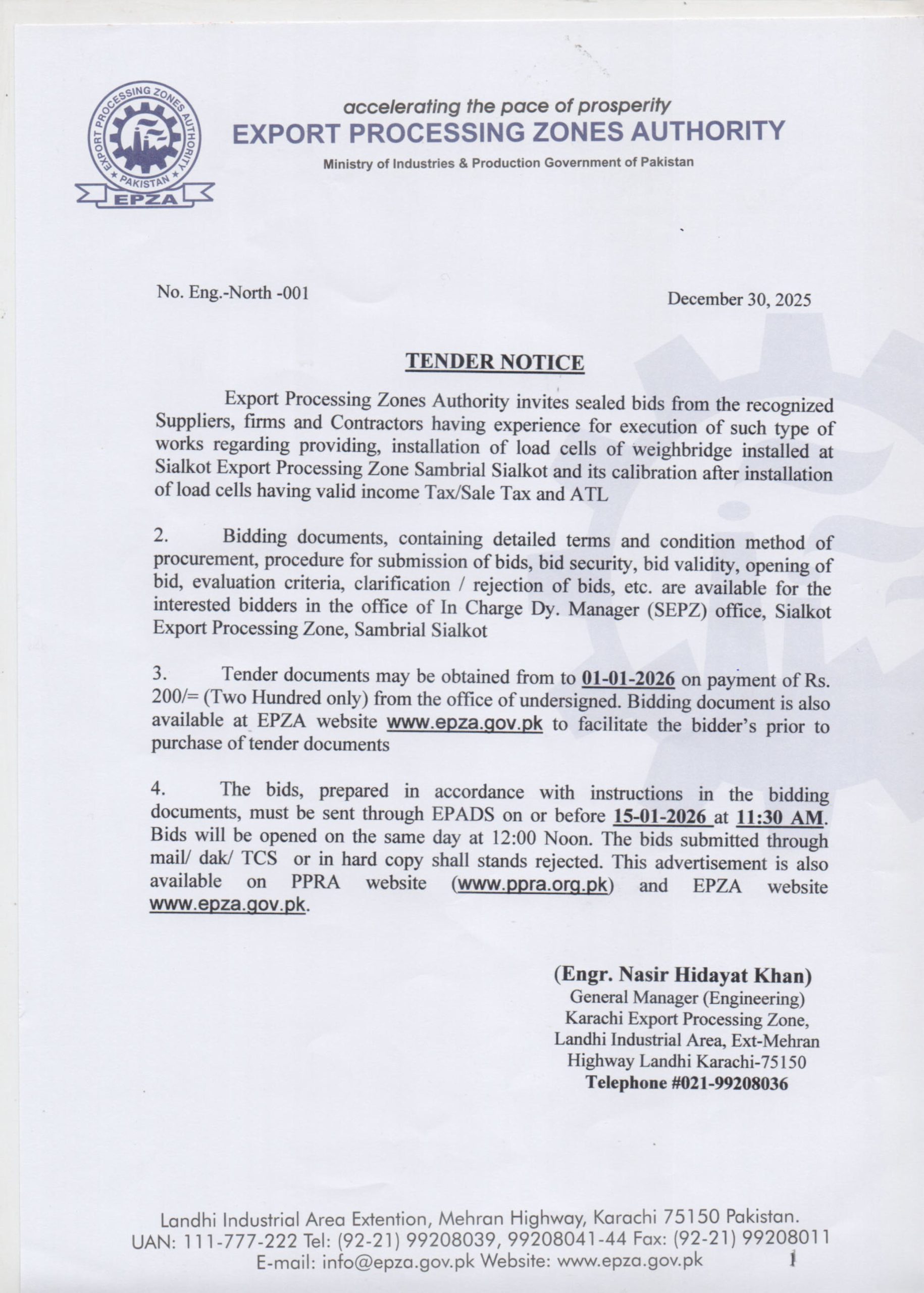 Providing, installation and calibration after installation of load cells of weighbridge installed at Sialkot Export Processing Zone, Sambrial, Sialkot.
